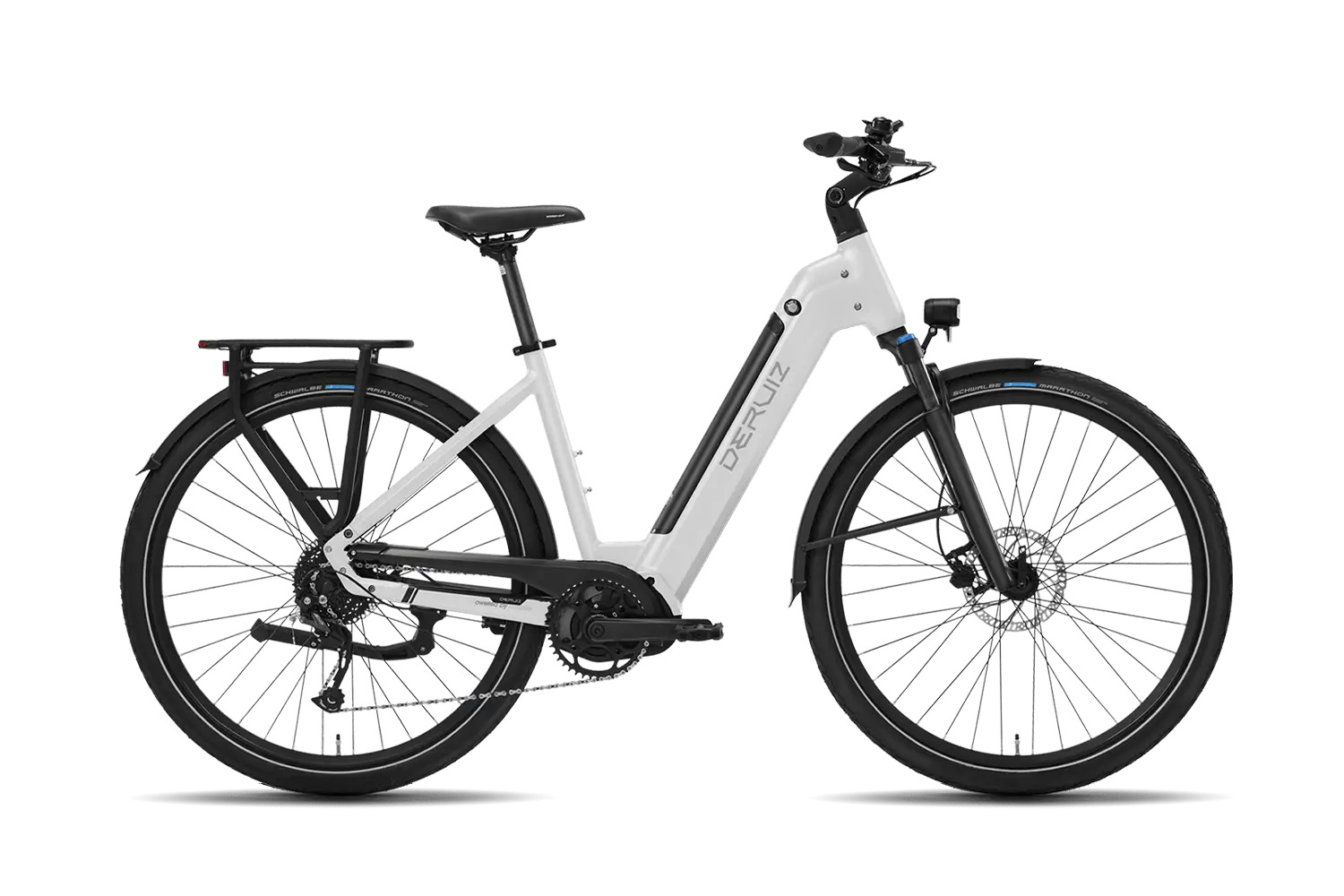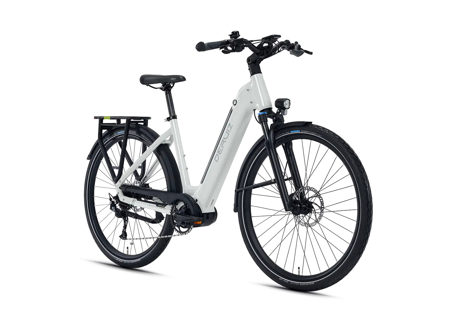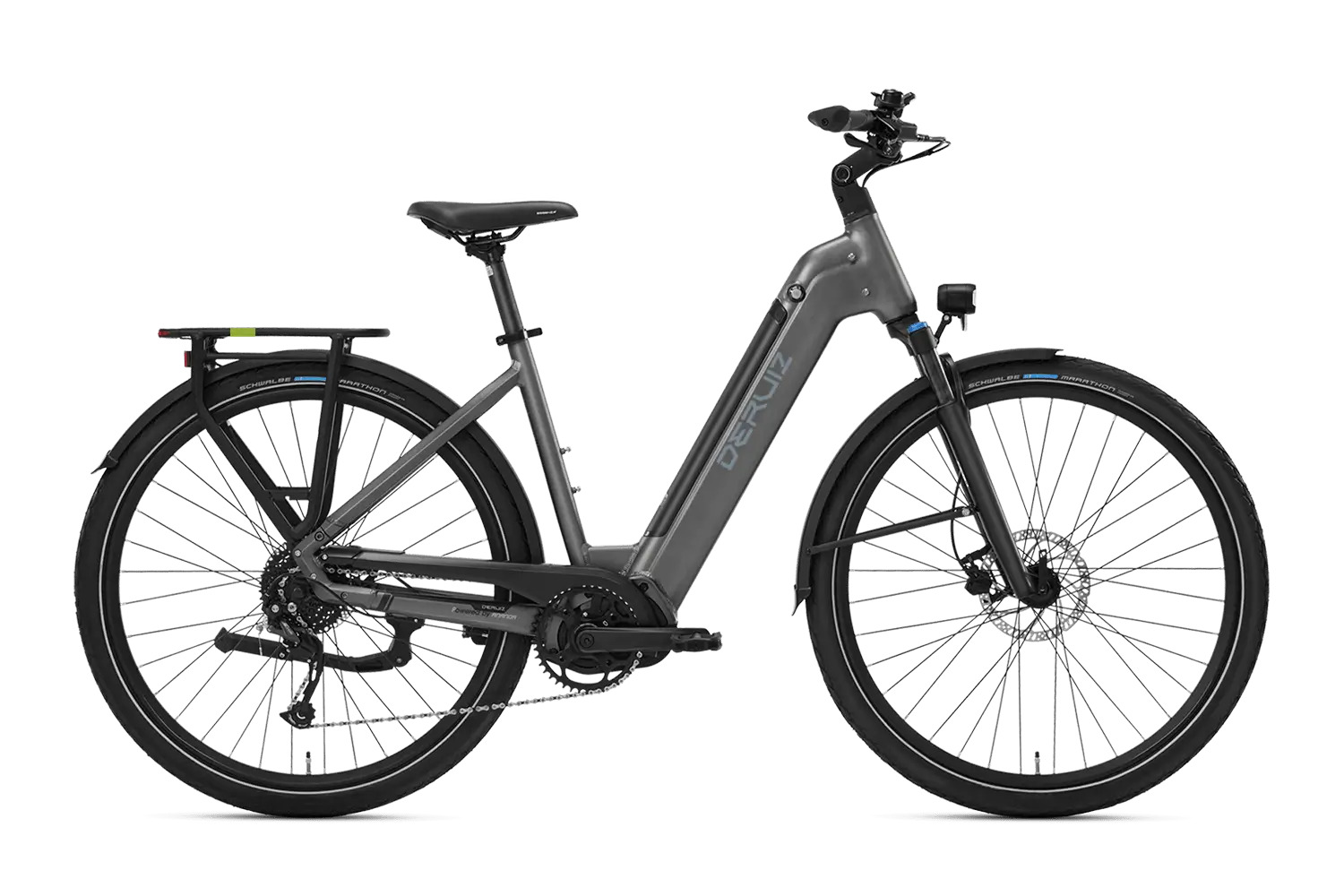 - Display: LCD-Farbdisplay mit 0–5 Unterstützungsstufen, zeigt Geschwindigkeit, Akkustand, Reichweite; Bluetooth zur DERUIZ+ App.