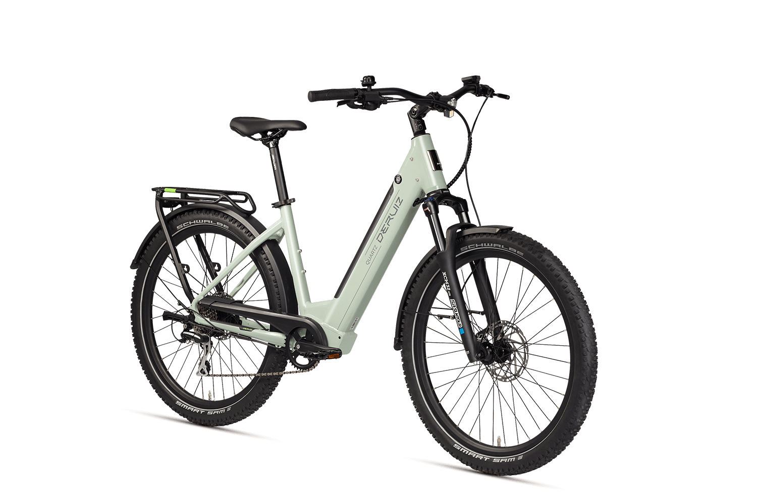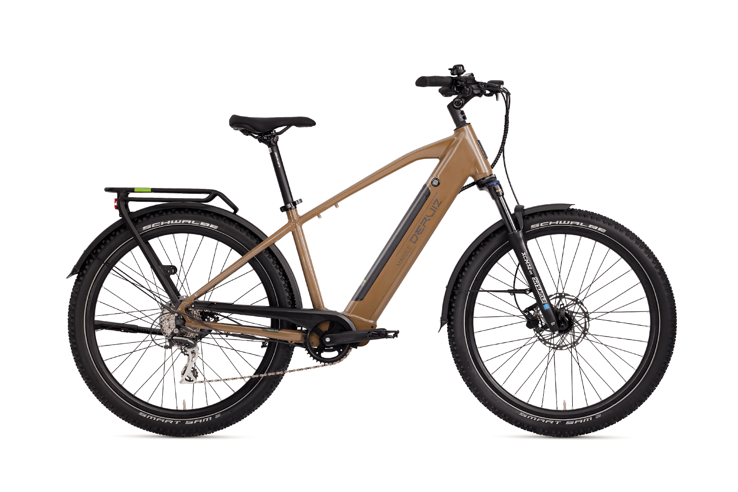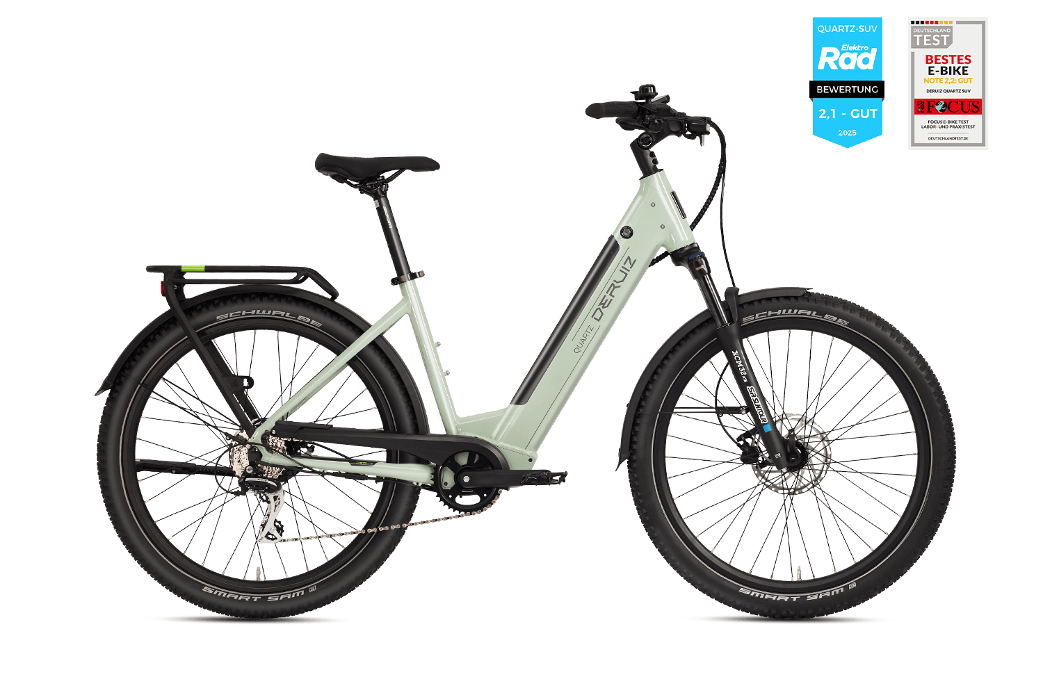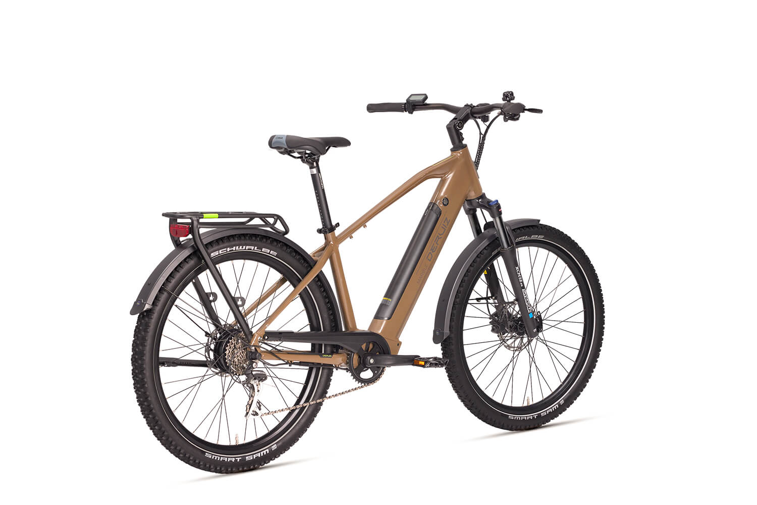 - Display: LCD-Farbdisplay mit 0–5 Unterstützungsstufen, zeigt Geschwindigkeit, Akkustand, Reichweite; Bluetooth zur DERUIZ+ App.